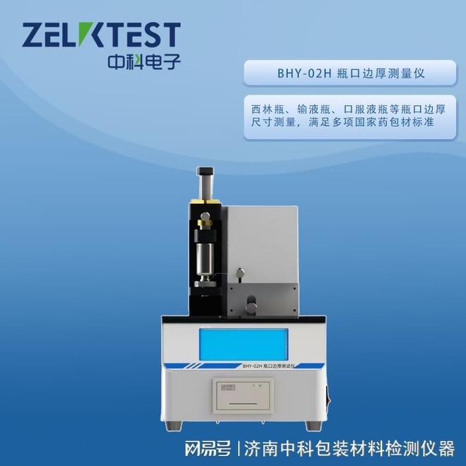 二、测量方法与操作流程1、仪器选择:推荐使用BHY-02H 瓶口边厚测量仪(济南中科电子研发),其技术参数完全符合YBB00022004-2015标准要求,支持高精度测量(分辨率0.01mm,示值误差≤0.05mm)。2、操作步骤:设备校准:每次测量前需用标准样品校准仪器,确保测量精度。样品准备:选取无划痕、无变形的待测瓶口,清洁表面杂质。固定样品:将瓶口垂直固定于仪器测量台上,确保测量头与瓶口边缘平行接触。数据采集:启动仪器,测量头自动扫描瓶口边缘厚度,记录最大值、最小值及平均值。结果判定:对比测量值与标准限值(如8.70mm±0.25mm),判断是否合格。3、注意事项:环境控制:测量环境需保持温度23℃±2℃、湿度≤80%RH,避免温湿度波动影响测量结果。重复测量:每批样品建议随机抽样3-5个进行多次测量,取平均值作为最终结果。三、济南中科电子技术优势与适用场景BHY-02H 瓶口边厚测量仪核心功能:高精度测量:量程0-10mm,分辨率0.01mm,满足±0.25mm公差要求。智能化操作:工业级彩色触摸屏,视图清晰,实时显示测量值、统计值(最大值/最小值/平均值),支持历史数据快速查看,并配置微型打印机。多场景适配:模块化设计,可适配西林瓶、输液瓶等多种规格瓶型,单次测量响应时间≤0.5秒。合规性设计:多级用户权限管理,密码登录,方便用户管理,符合GMP数据完整性要求。适用场景:药包材生产企业:用于生产线上瓶口边厚的在线检测,确保产品一致性。制药企业质检部门:作为出厂检验工具,验证瓶口密封性能。第三方检测机构:为客户提供标准化检测服务,出具权威报告。总结YBB00022004-2015标准对硼硅玻璃管制口服液体瓶的瓶口边厚提出了严格要求,而济南中科电子BHY-02H 瓶口边厚测量仪以其高精度、智能化及多场景适配能力,成为满足标准检测需求的理想工具。通过科学测量与规范操作,企业可有效保障产品质量,提升药品包装的安全性与稳定性。