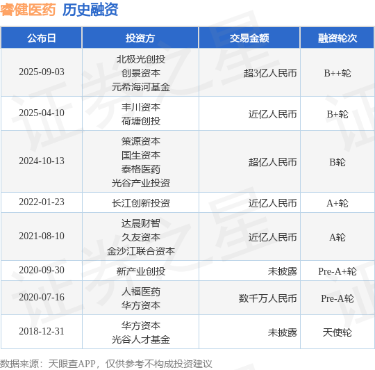 证券之星消息,根据天眼查APP于9月3日公布的信息整理,睿健毅联医药科技(成都)有限公司B++轮融资,融资额超3亿人民币,参与投资的机构包括北极光创投,创景资本,元希海河基金。